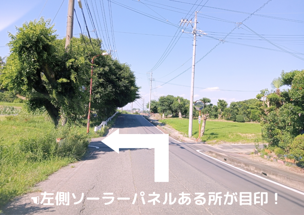 600m先の左側ソーラーパネルが見えたら左折し細い道へ